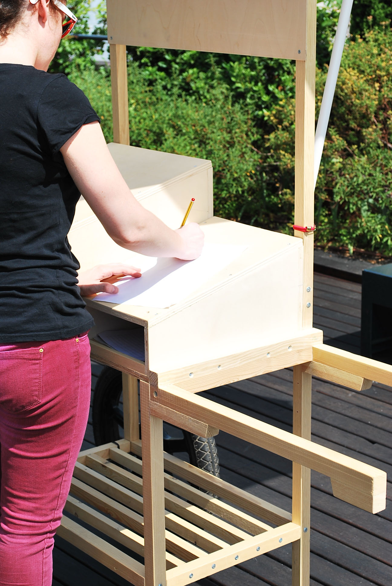 Konvertible y Submarina diseñamos y construimos un artefacto que permite la visibilidad de las actividades de la Asociación A Pie, y funciona como punto de feed back recogiendo las opiniones de los ciudadanos en un buzón de sugerencias. El carrito puede trasladarse por la ciudad facilitando de esta manera las futuras intervenciones de la asociación en el espacio público.