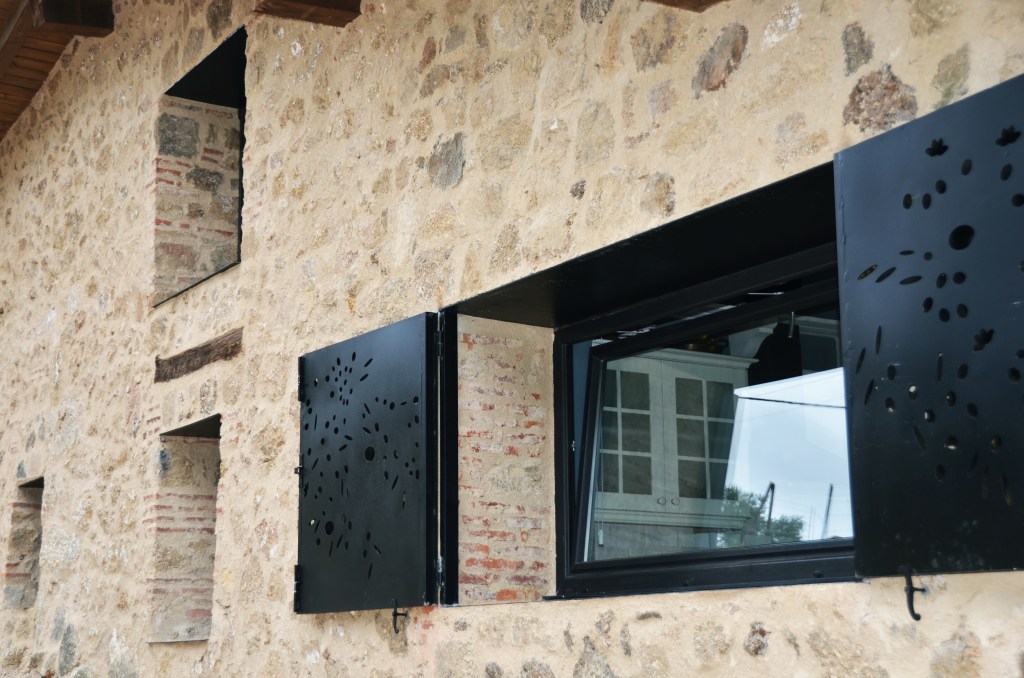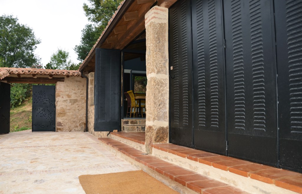 Se reutilizan restos de materiales que se encontraban en el solar, como vigas antiguas de madera, pilas de piedra, o ruedas metálicas de la almazara. Estas piezas se han integrado en el jardín exterior, o transformado en lámparas y mobiliario. Se ha dado nueva vida a muebles antiguos adaptándolos al nuevo conjunto.