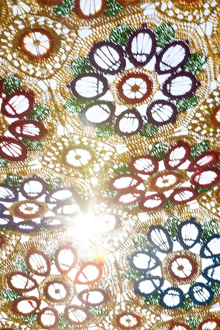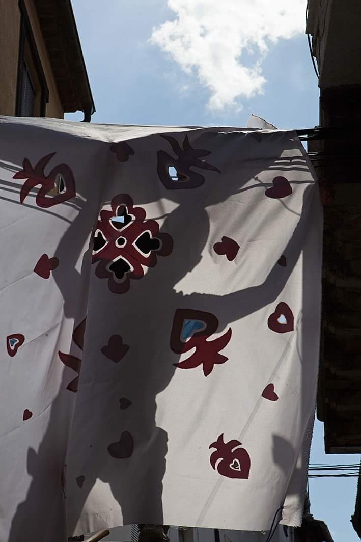 Introducimos un nuevo formato: parasoles picaos, inspirados en los motivos que se realizaban sobre el guardapiés del traje tradicional de las mujeres. Los picaos consistían en motivos o símbolos cargados de información sobre la persona que los vestía: los colores o el tipo de flores representaban el estado social. Los pájaros, la alegría y libertad, con distintas connotaciones en función del pájaro. O simbologías sobre el tipo de trabajo realizado por la familia.
