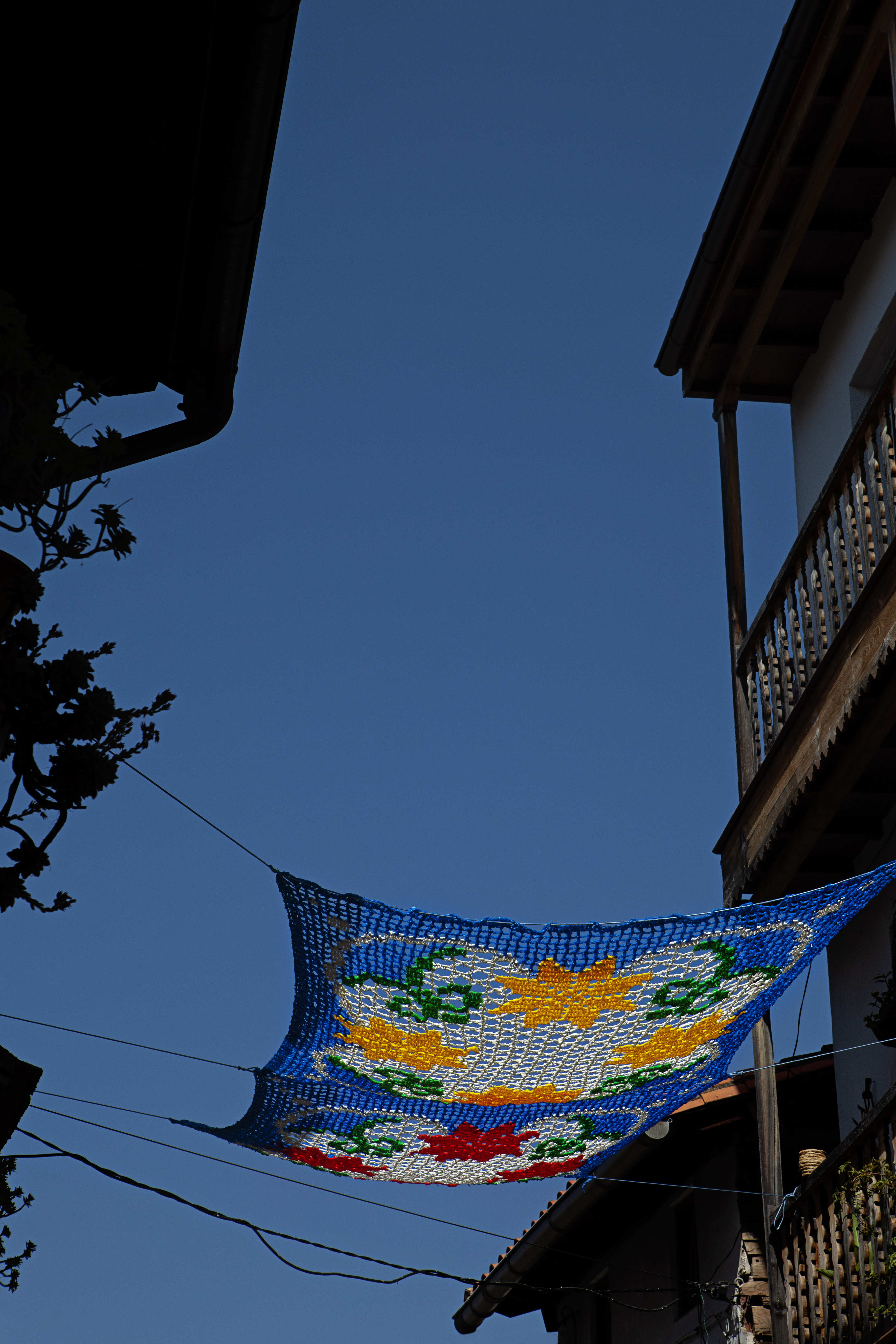 [08/09-2020] Los parasoles vuelven a las calles de Valverde de la Vera. Aunque este año no hemos realizado talleres por el coronavirus, tejer las piezas ha sido sanador, conectadas en la distancia.