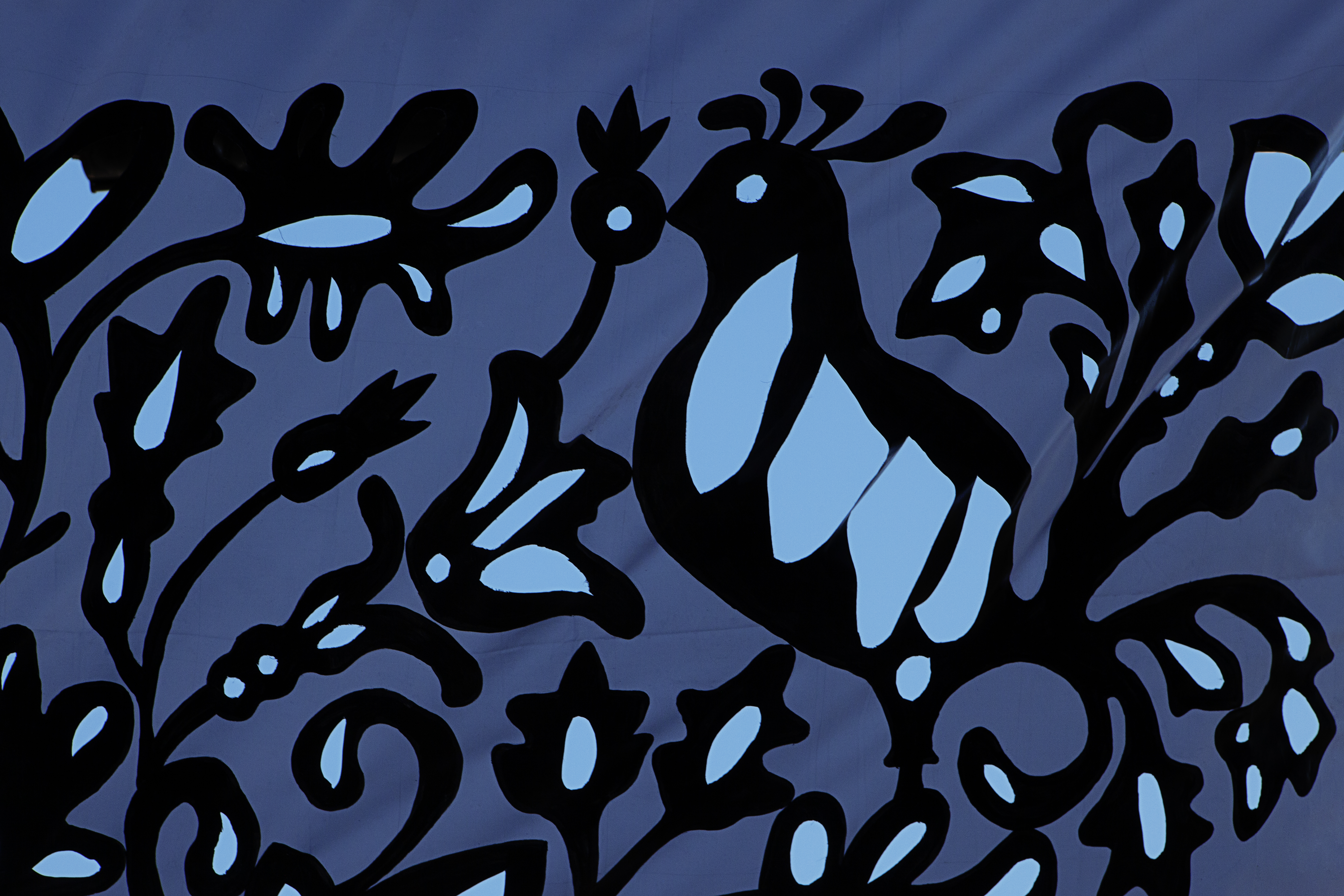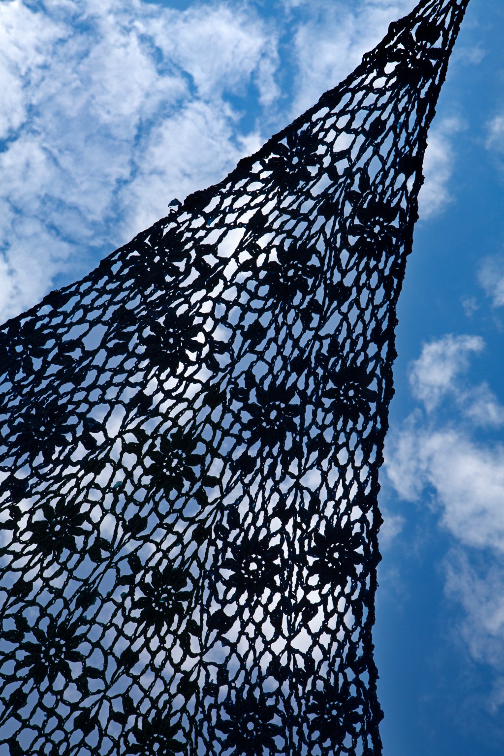 Instalamos un manto con flores blancas tejido por nuestra compañera Julia Casado en memoria de las víctimas por Covid.