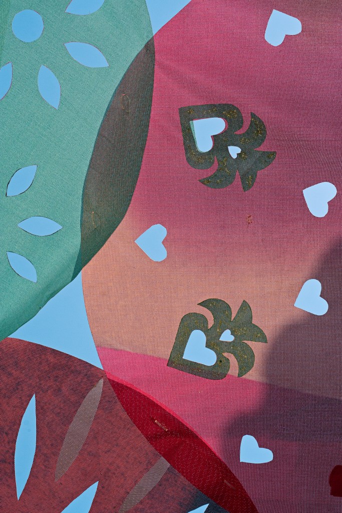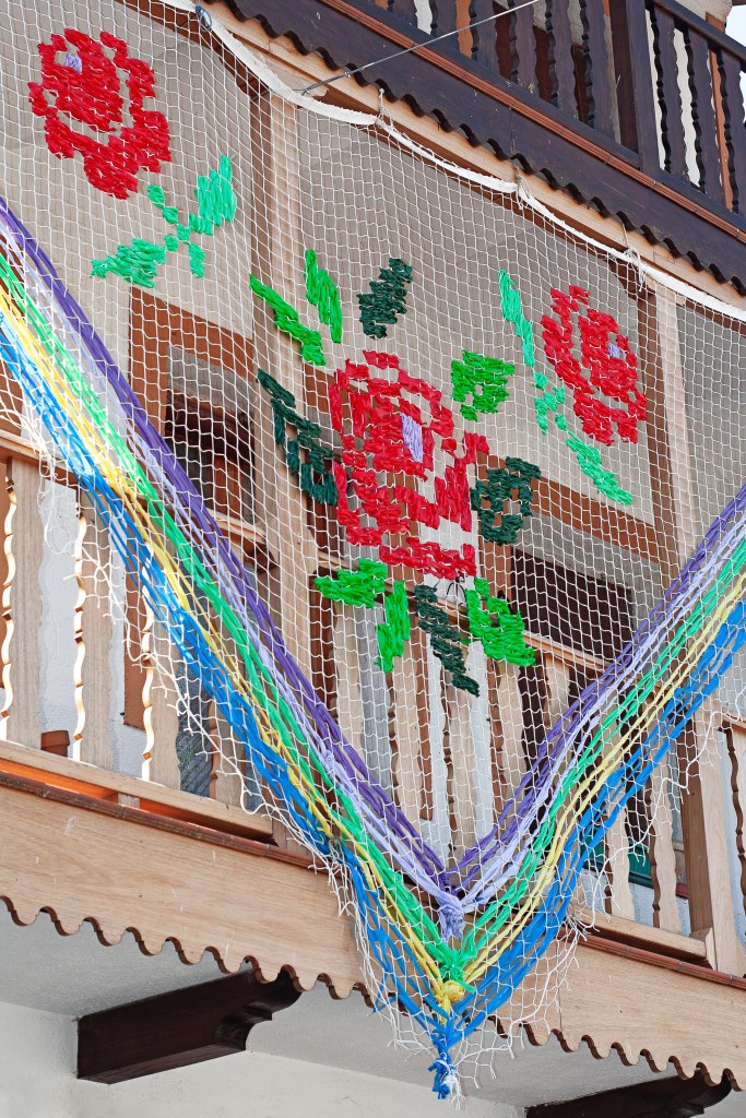 Paseando por Valverde encontramos piezas muy variadas: mariposas de Candela, golondrinas de Antonio Alvarado, flores por Ucrania de Nuria De Padua Ariza y Julia Casado Fernández, picaos florales de Marina con retales de tela de parapente, la gran pajarita de Manuel V. Fernández Sánchez… A ganchillo, y también una nueva tipología que hemos comenzado en los talleres del pasado año: parasoles con picaos a base de lona plástica publicitaria reutilizada, gracias a la cesión del anuncio de la serie de Lola de Movistar + en la Gran Vía de Madrid, a través del responsable de escenografía Jorge León. Y un gran mantón tipo Manila, sobre la red de pesca que nos regaló Jose Luís, marinero redero de Pasajes.