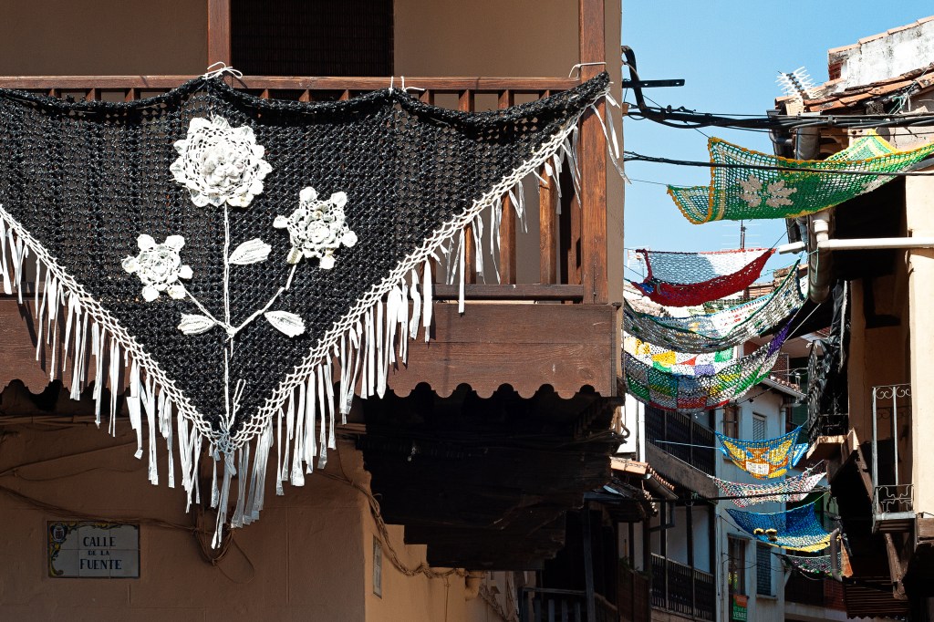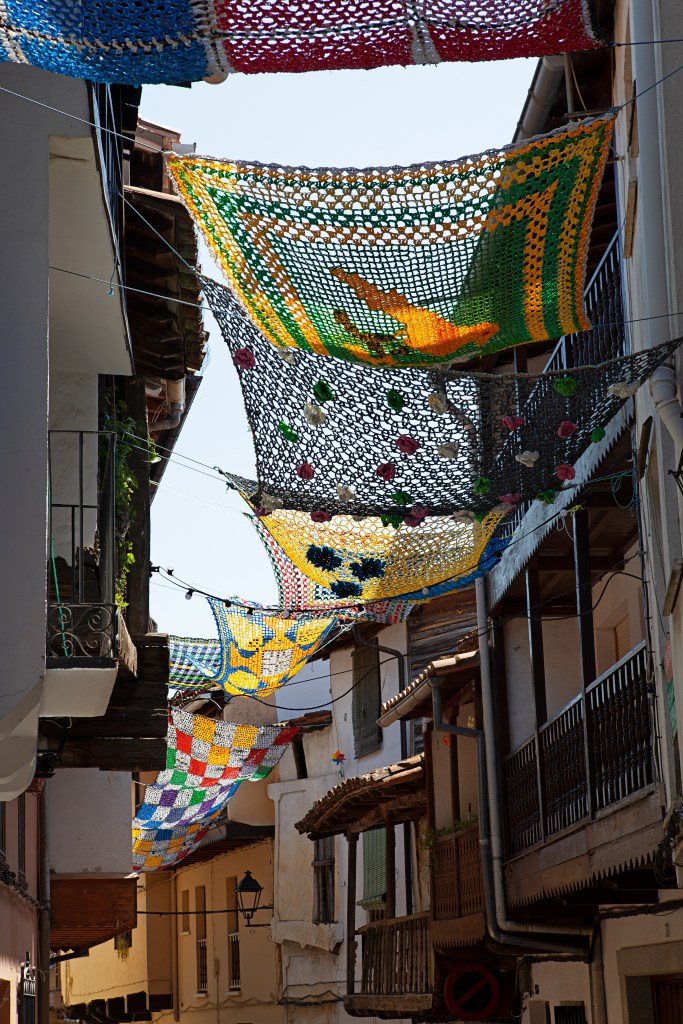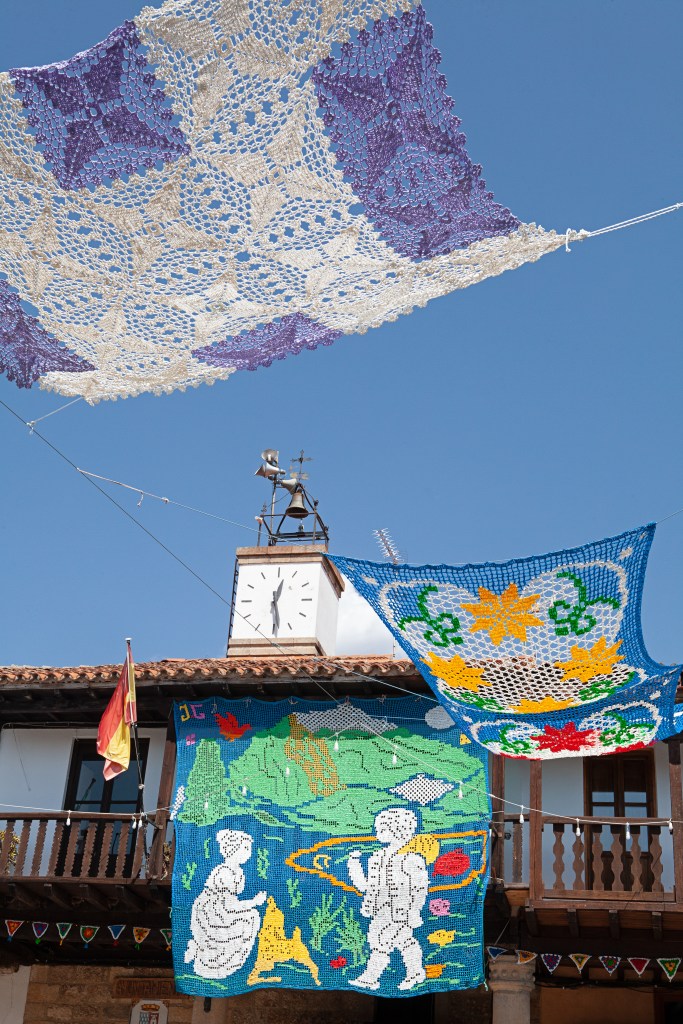 [07/09-2022] Diez años Tejiendo la Calle. Instalación en Valverde de La Vera. En esta edición contamos con la colaboración de Antonio Alvarado, Premio Nacional de Moda 2021, con las tejedoras Maria Blanca y María Cruz, gracias a Lanzaroco Casa Rural. Realizamos un cartel especial con las fotografías de Asier Rua y el diseño de Diego Lara.