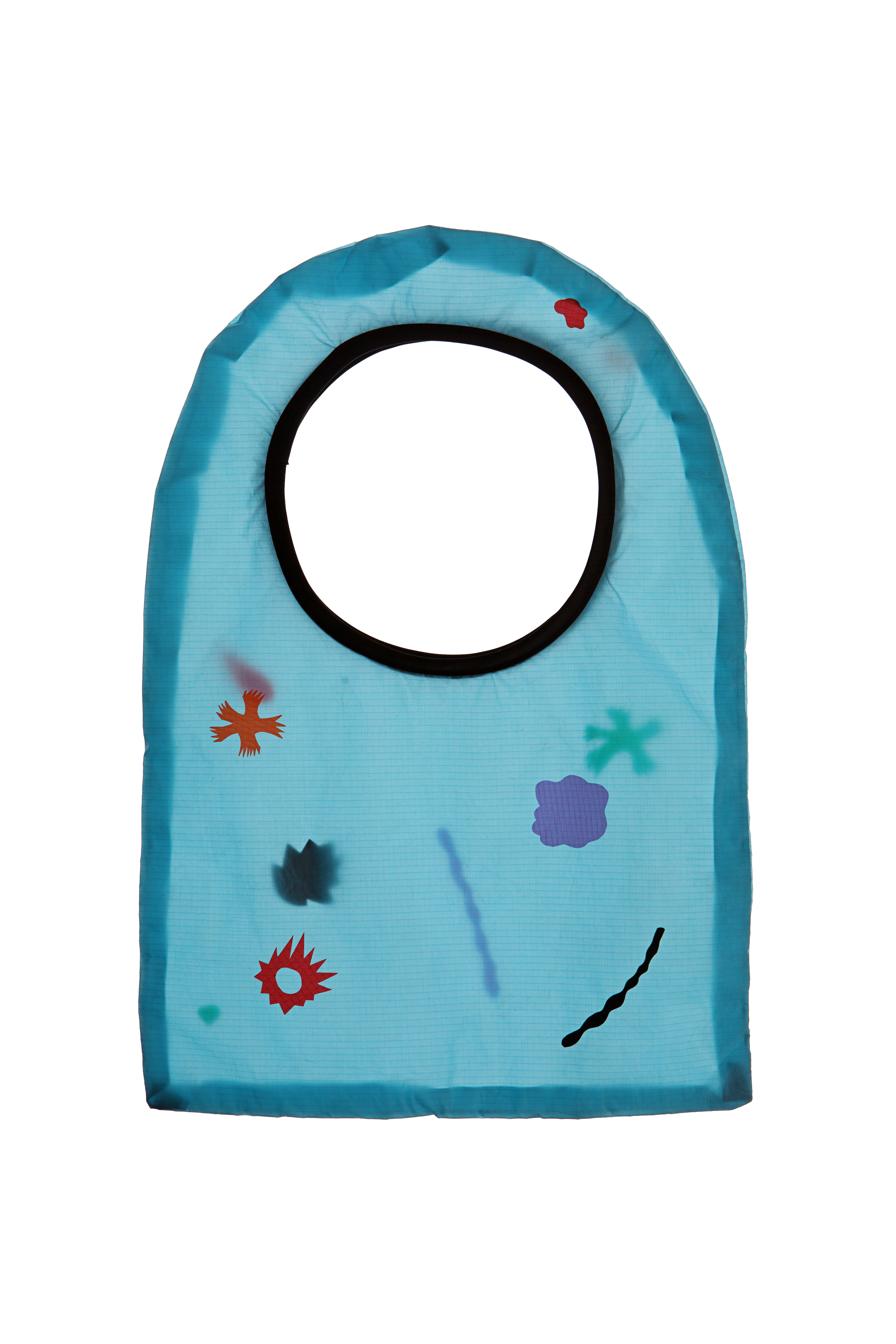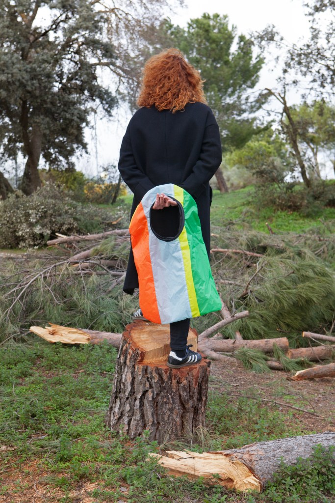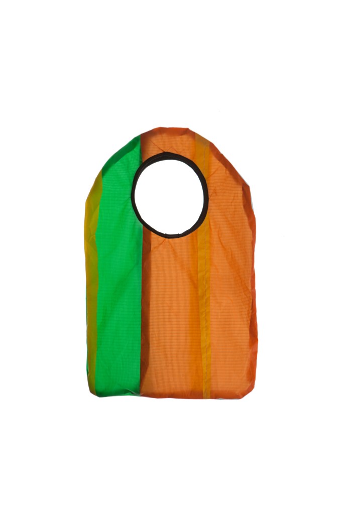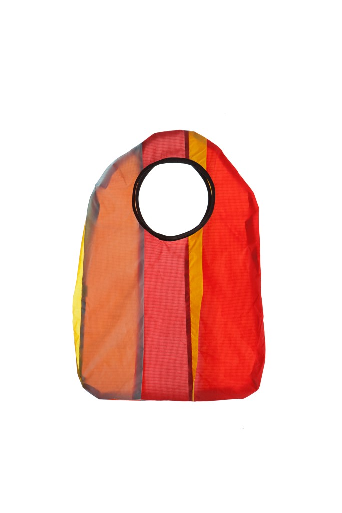 En este proyecto se transforma un material ya existente a través de un proceso artesano. Se trata de tejido de nailon ripstop de gran ligereza, perdurable y con entramado de hilos antidesgarro. Translúcido y de vivos colores. Este material es utilizado habitualmente para la confección de elementos que requieren de una alta resistencia, como globos aerostáticos, cometas, velas y paracaídas. Tras cortar y lavar el tejido, las bolsas son elaboradas a mano.