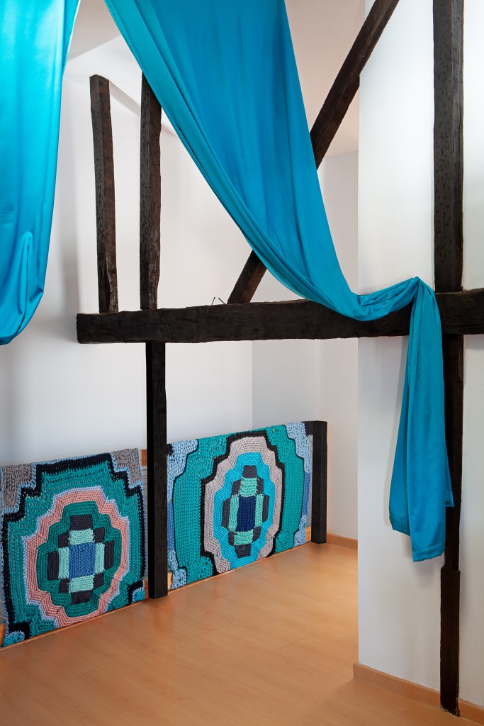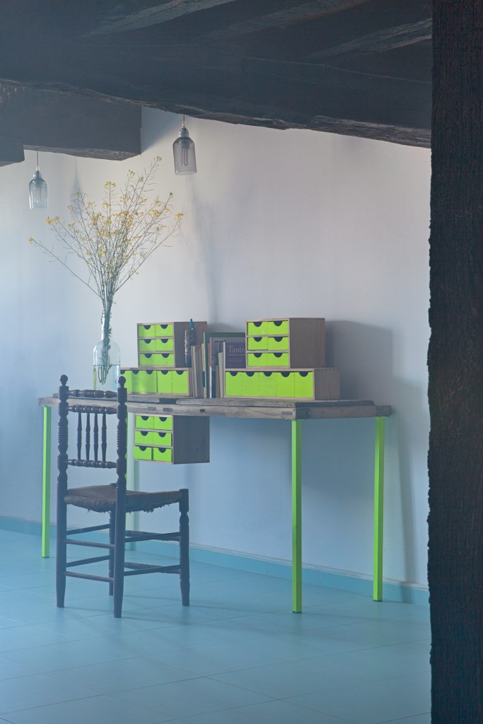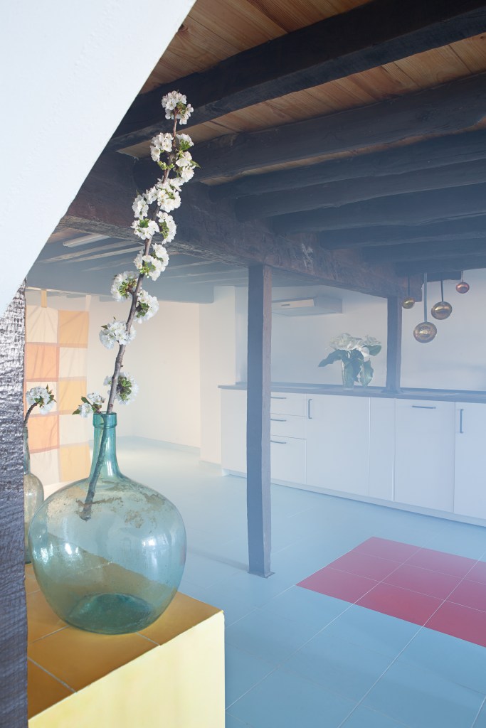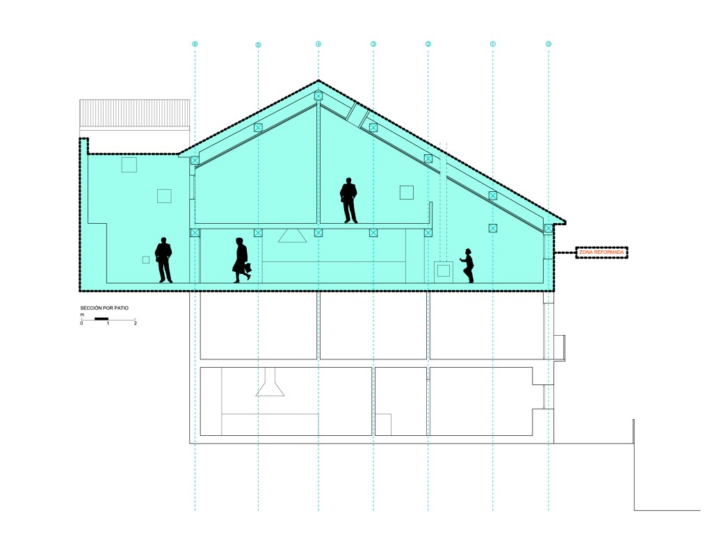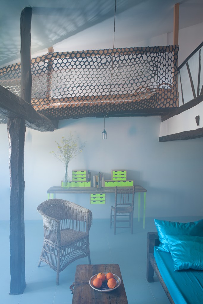 En la casa, las vigas, los muebles, las carpinterías y algunas herramientas son de madera de aquella montaña. De color rosa pálido cuando era joven, ahora oscurecida por el paso del tiempo y por el humo. Jacinto, el albañil, retira adobes viejos, carbones y cenizas. Desmonta la lumbrera, todavía con restos de fuego. Desplazamos los muebles, los materiales y enseres. Reutilizamos parte del material existente en la casa, transformando los antiguos portones de madera en «El Cerezo en Flúor, sistema de mesas». Reutilizamos telas para tejer tapices de ganchillo en las barandillas, con dibujos de las labores de la familia, pertenecientes a su memoria. Lo que permanece y lo que se transforma coinciden en este mismo espacio. El estado original y la nueva etapa que está por llegar.