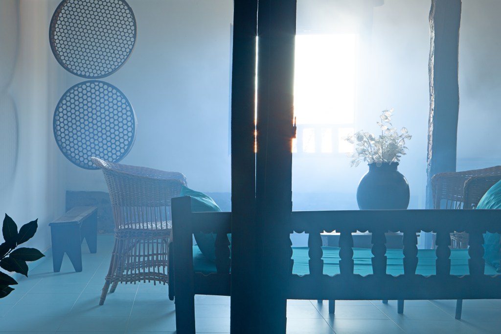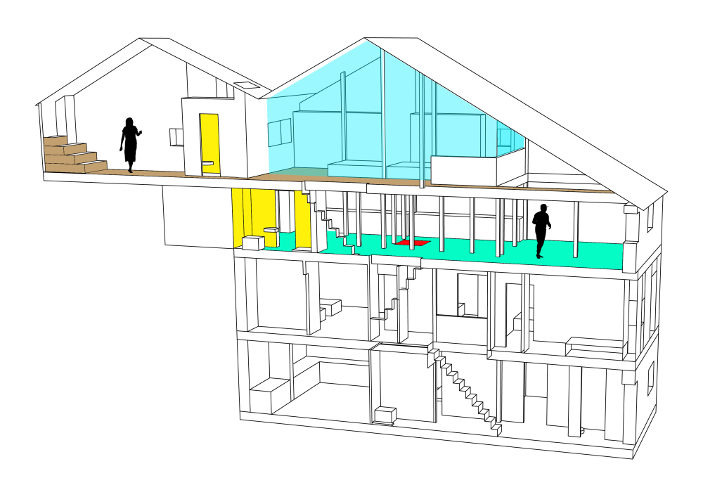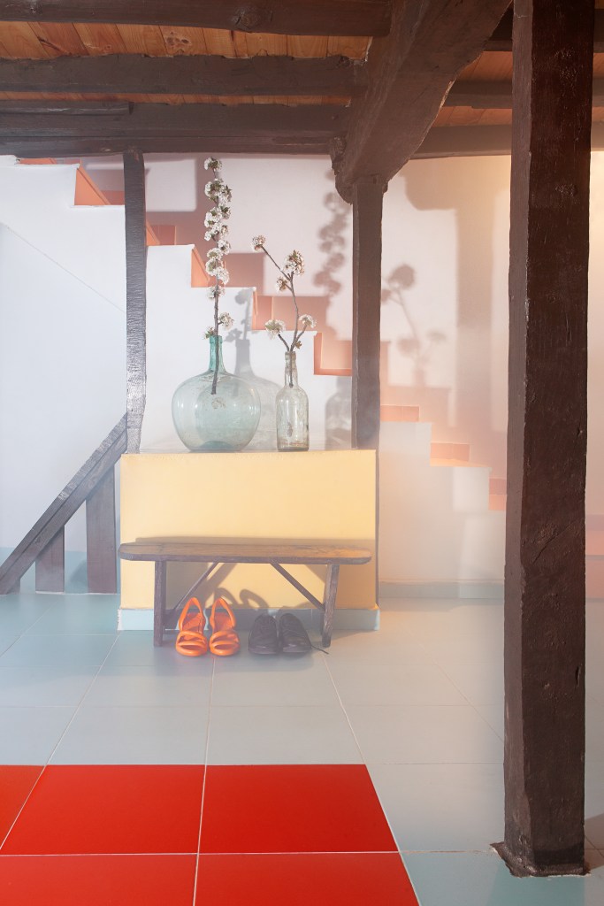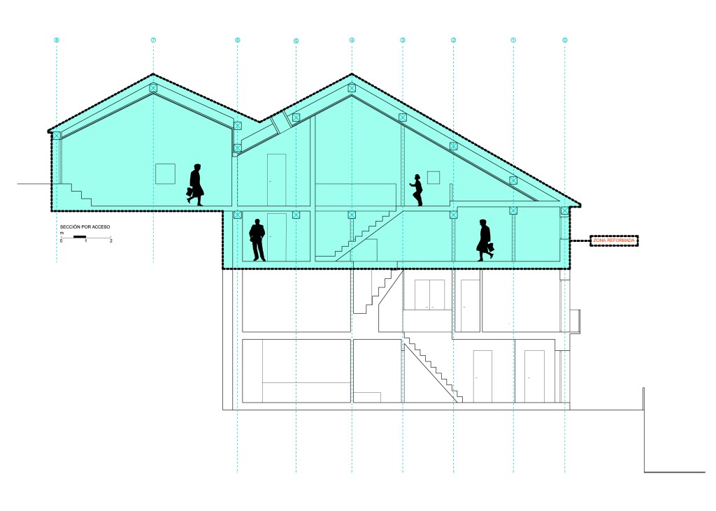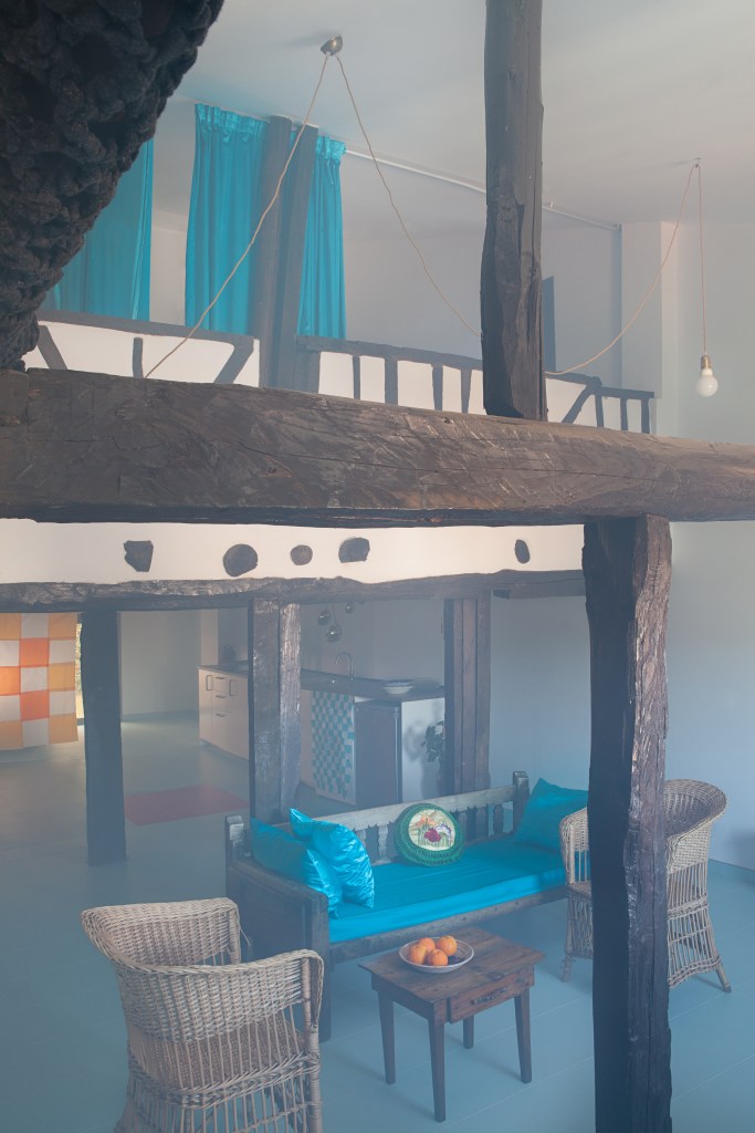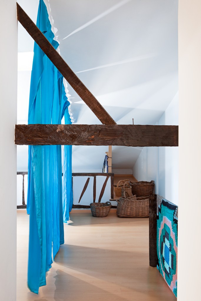 En la casa, las vigas, los muebles, las carpinterías y algunas herramientas son de madera de aquella montaña. De color rosa pálido cuando era joven, ahora oscurecida por el paso del tiempo y por el humo. Jacinto, el albañil, retira adobes viejos, carbones y cenizas. Desmonta la lumbrera, todavía con restos de fuego. Desplazamos los muebles, los materiales y enseres. Reutilizamos parte del material existente en la casa, transformando los antiguos portones de madera en «El Cerezo en Flúor, sistema de mesas». Reutilizamos telas para tejer tapices de ganchillo en las barandillas, con dibujos de las labores de la familia, pertenecientes a su memoria. Lo que permanece y lo que se transforma coinciden en este mismo espacio. El estado original y la nueva etapa que está por llegar.