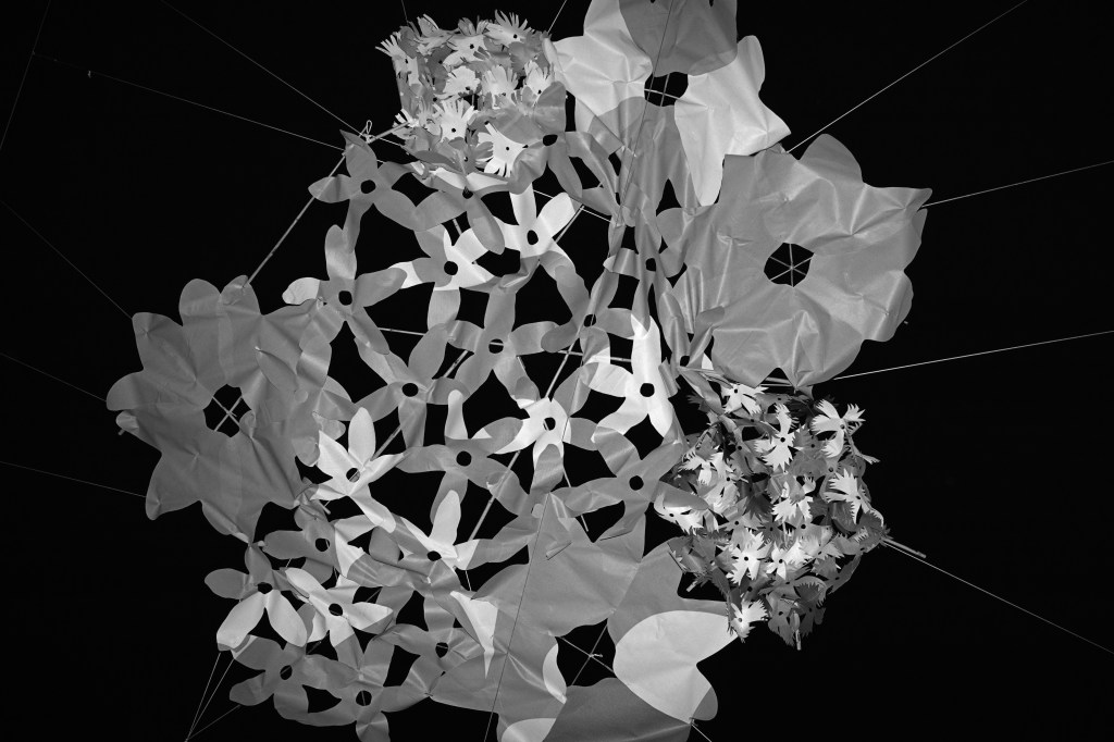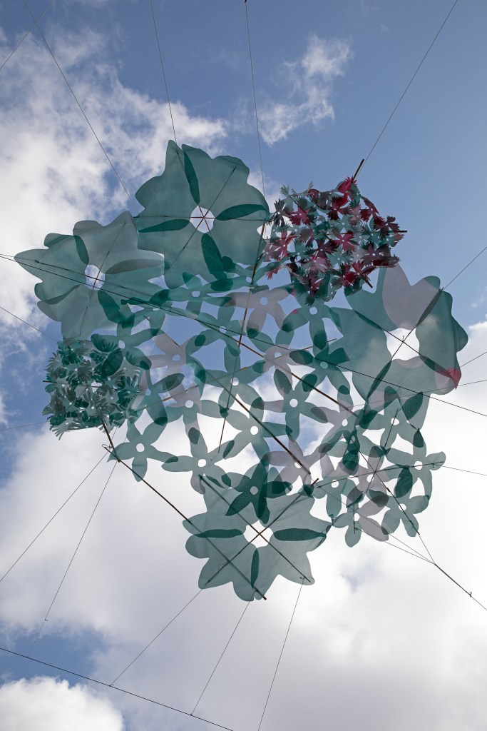 [2023, 2024, 2025] En Tejiendo la calle convertimos lona PVC de anuncios de publicidad en grandes patchworks o collages, dando otras vidas a un material de deshecho. Una retacería de siluetas de flores de plantas protegidas toman presencia en el pueblo. La hoja del Arce de Montpellier, la flor de la Asperilla, el precioso Clavelino, la flor de la Vitaliana Primuliflora. Especies fundamentales para la biodiversidad y el equilibrio de los ecosistemas, incluidas en el “Catálogo Regional de Especies Vegetales Amenazadas de Extremadura, actualizado con la Lista Roja de la flora vascular española 2008″. En 2024 realizamos bandadas de vencejos, ave del año 2021 por Seo BirdLife, una especie que antiguamente cohabitaba en los pueblos y que hoy está desapareciendo. En 2025 hacemos truchas, hace años se veían en las gargantas de la zona y hoy ya no son tan habituales.