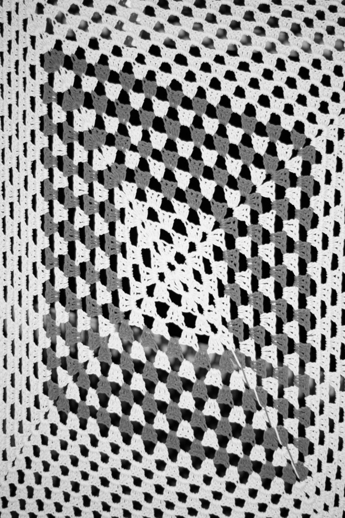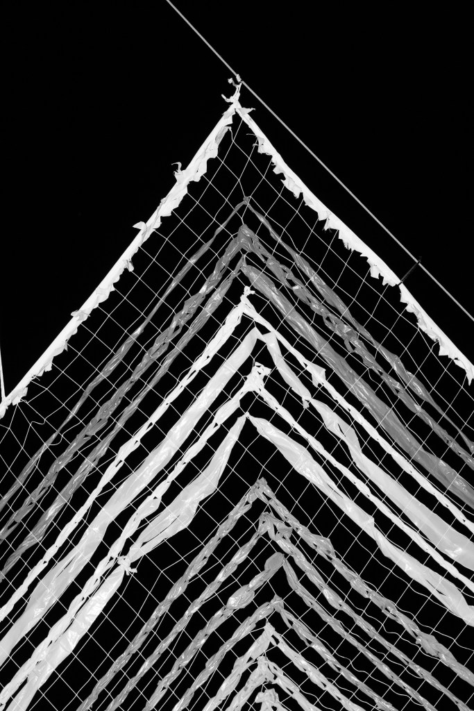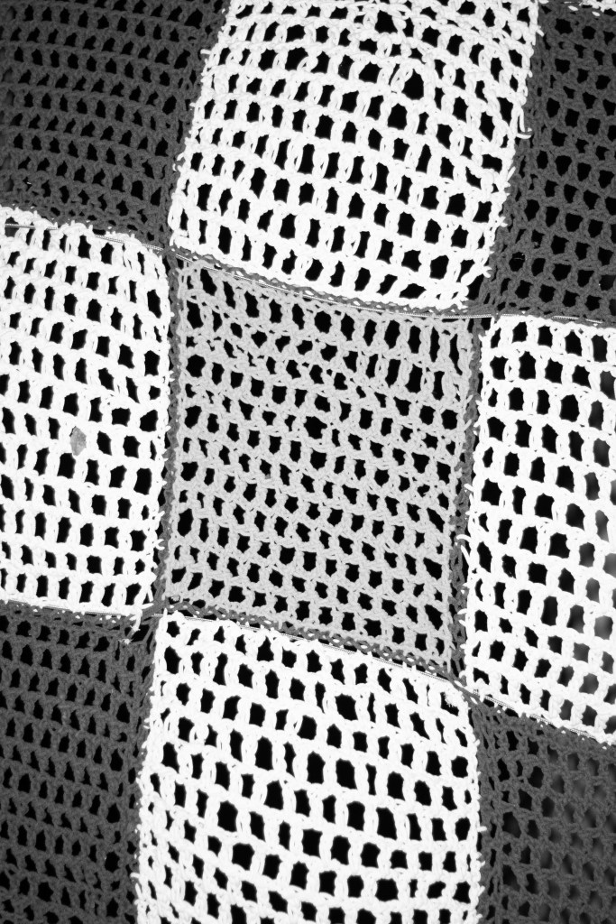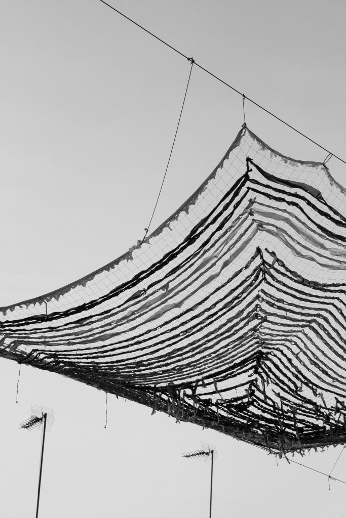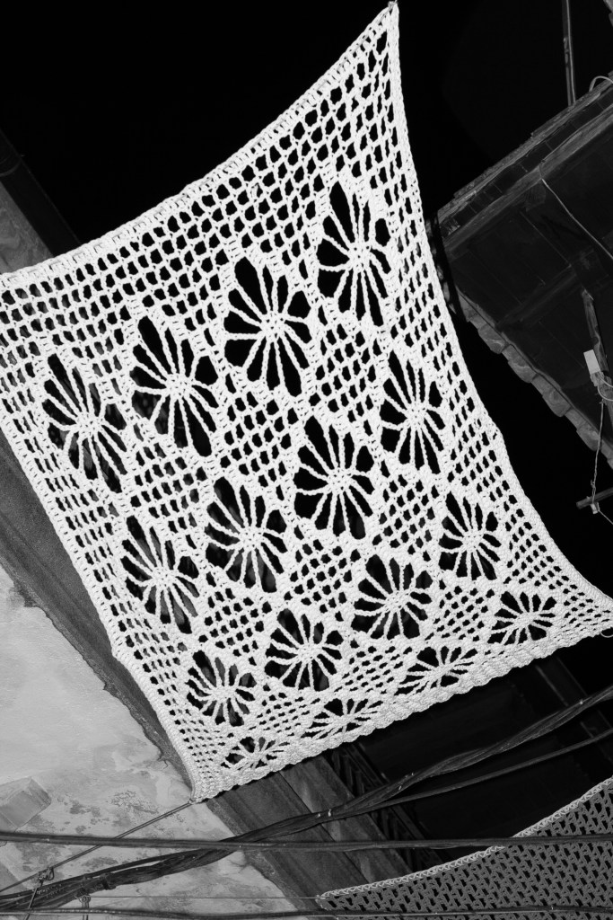 Tejiendo la calle 2025. Continuamos con los tejidos de ganchillo que realizamos habitualmente, e introducimos un nuevo material: bolsas de patatas a granel. Continuamos con «Remiendos del paisaje» y reutilizamos redes de pesca cedidas por Jose Luis, ex-marinero, redero de Pasajes, pueblo pesquero del País Vasco.