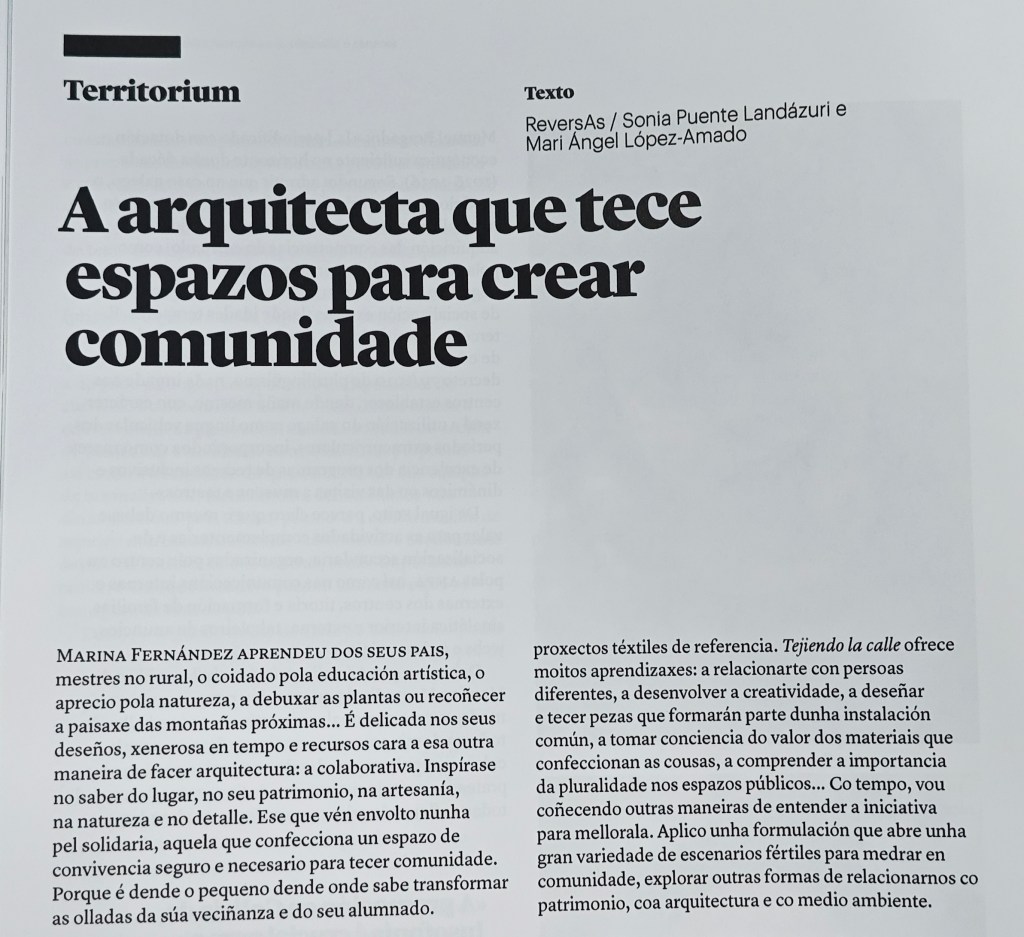 Creadora y directora de Tejiendo la calle. Publico el libro de Tejiendo la calle con RUA Ediciones en 2021, con fotografías de Manuel V. Fernández Sánchez y Asier Rua.