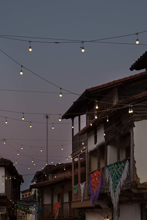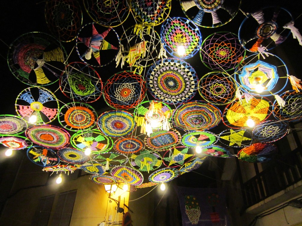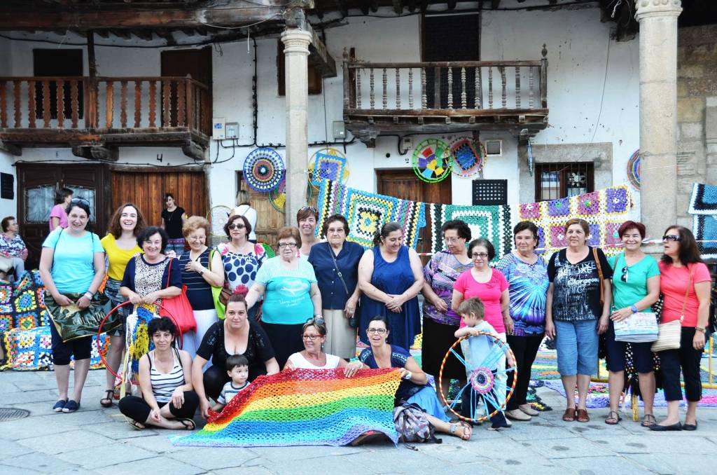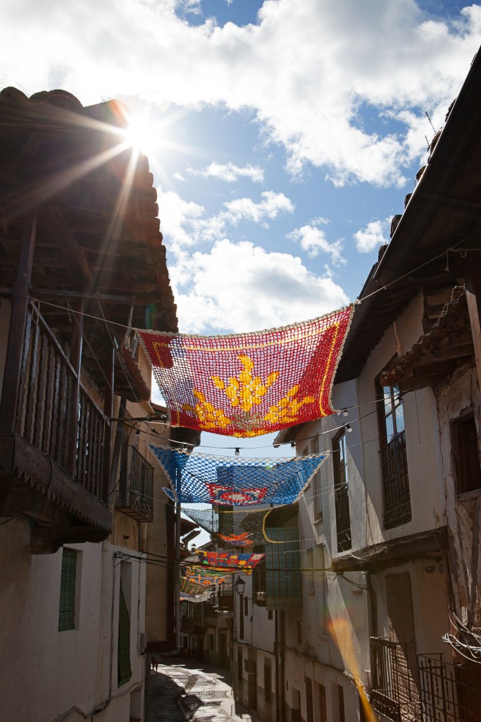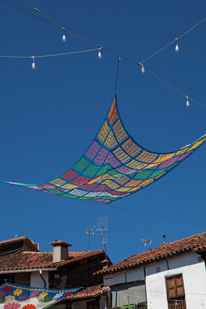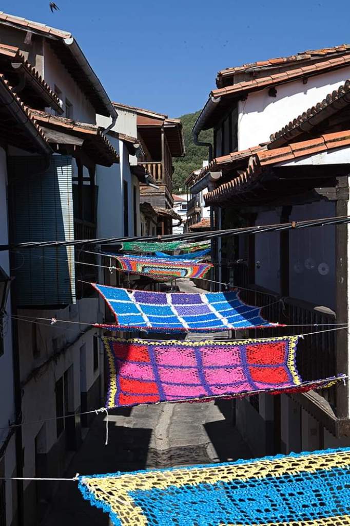 Fotografías del proceso de realización y la instalación de Tejiendo la calle en las calles de Valverde de la Vera.